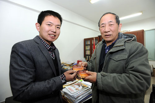 楚天金報訊 昨日,金報周末義工隊的義工盧少忠等人,找到吳天祥老人,送上了自己的新年禮物——50份《楚天金報》的訂報卡。 昨日中午11時半,吳天祥接過義工盧少忠遞來的訂報卡,連聲道謝:“我代表那些受幫扶家庭感謝你們的好心!”吳天祥說道。 5年來,吳天祥曾多次來到義工隊現場,跟大家一起為社區居民服務,給義工們留下了深刻印象。受此感染,常年在義工隊為居民免費清洗皮具的盧少忠,便委托記者定制了訂報卡,希望借吳天祥之手送與他人,以表達對吳老的崇拜和感激。