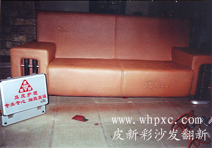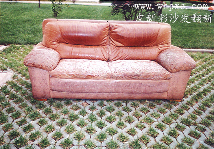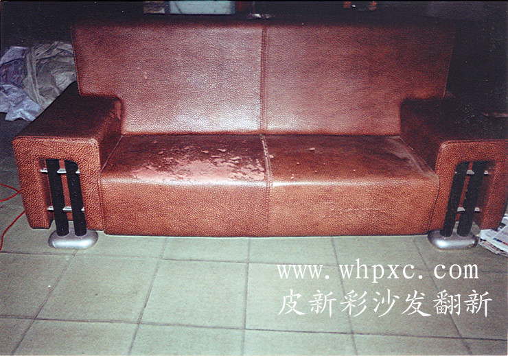 這個沙發放在車庫里面已經嚴重發霉,在翻新之前我們要把沙發海綿拆下來爆嗮,然后把皮面清洗干凈,再用磨砂皮成膜劑調色漿進行上色,每上兩次色都要打磨一遍做一次固色處理,直到整個皮面顏色一致為止。這個沙發翻新后手感很差。皮新彩翻新熱線13554633331
