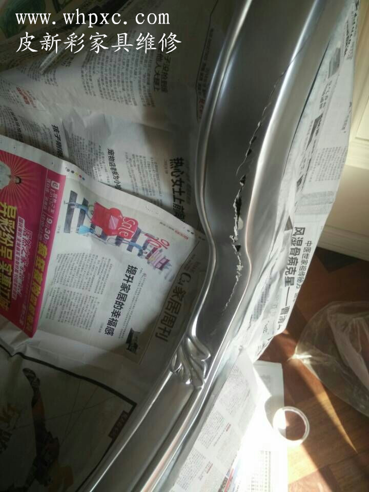 金屬漆家具維修,這個歐式家具是樹脂做的中看不中用,破損的地方居然是空的,我們用鋸末和膠水把窟窿填平,然后打磨再調(diào)金屬漆上色噴涂,修完之后幾乎看不出來,其強度比原來更好。皮新彩家具維修熱線13995508166