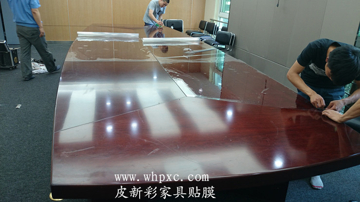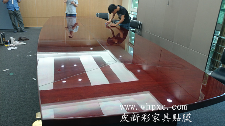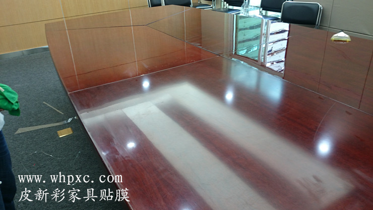 會議桌貼膜,辦公室裝修了,舊家具棄之可惜用又太舊,整個噴漆翻新污染大,周期長費用高,還是貼膜效果好又便宜又快,還沒有污染,皮新彩辦公家具貼膜電話:13995508166