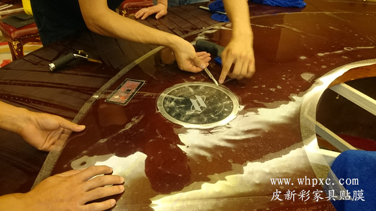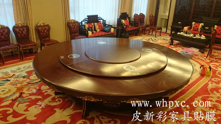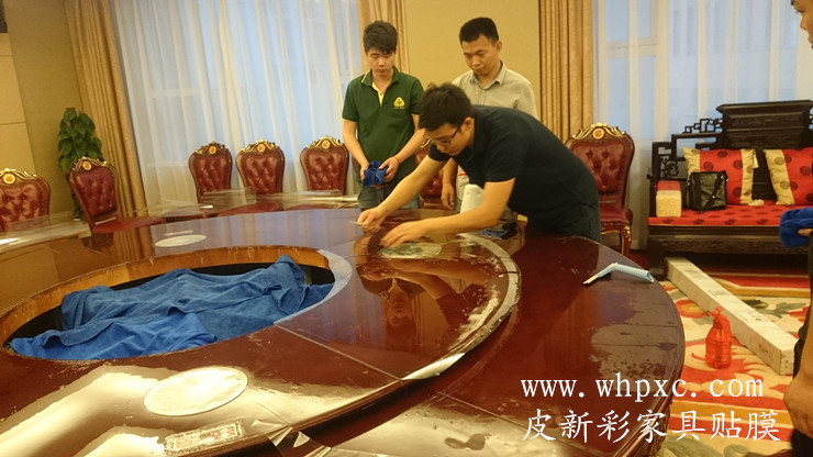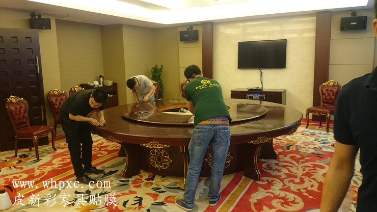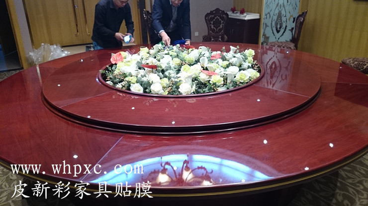 酒店餐臺貼膜,酒店高檔實木大餐臺無法鋪桌布,餐具摩擦又容易把漆面劃傷,這種餐臺用一段時間后就會出現煙頭燙傷和劃傷,我們把損壞部位修好以后再貼膜又像新的一樣,皮新彩酒店家具貼膜電話:13995508166