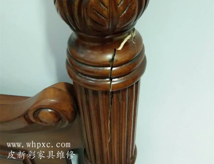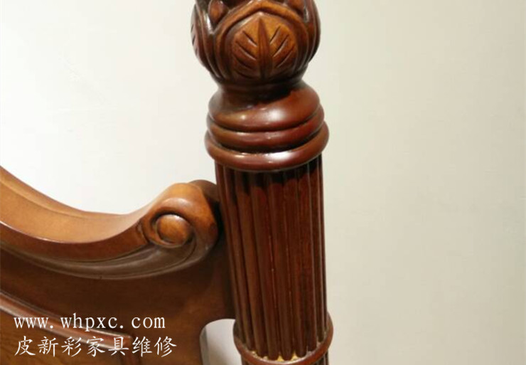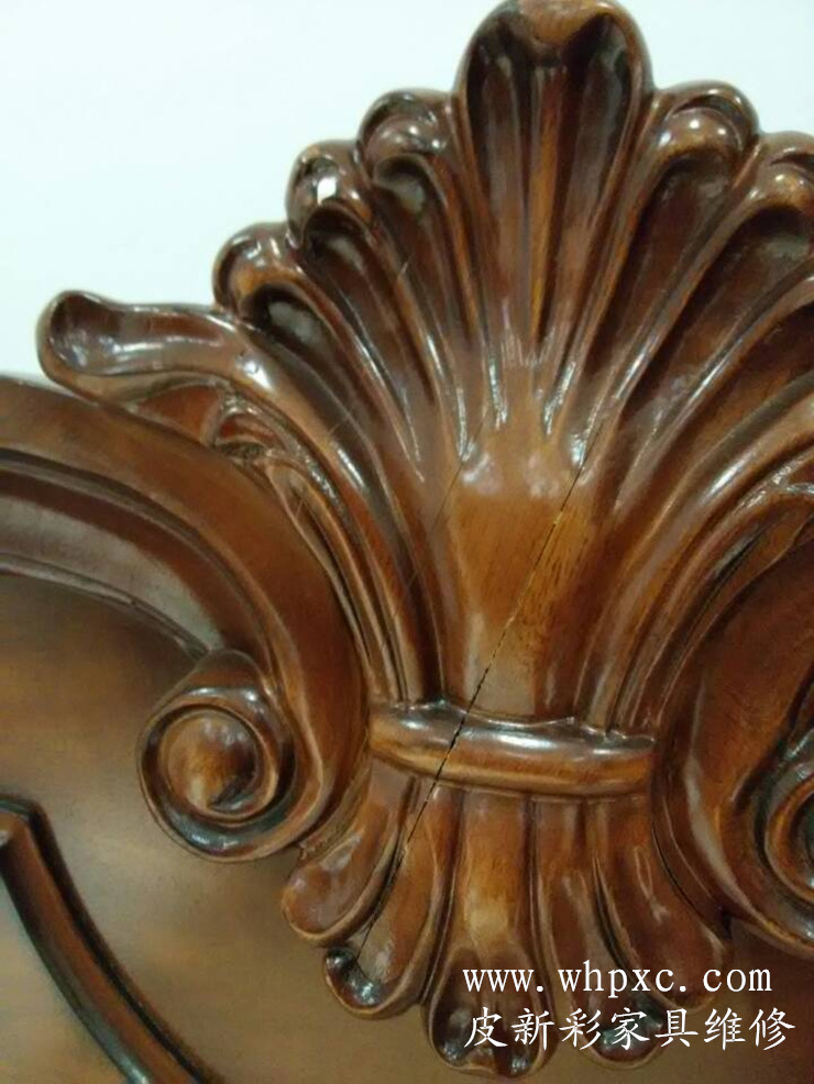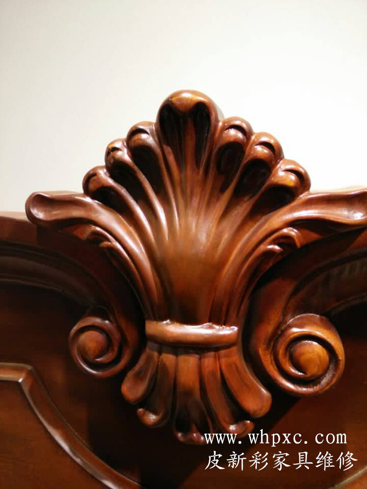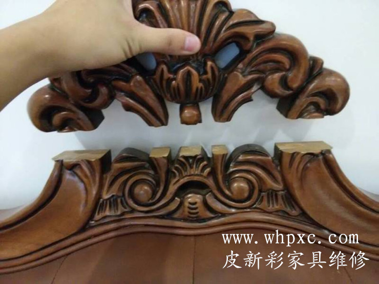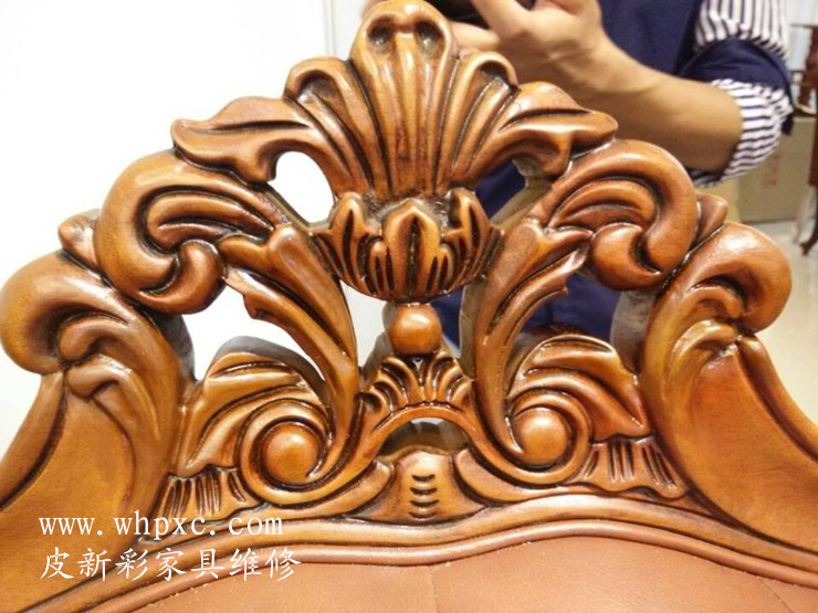 歐式雕花炸裂,用鋸末加膠水填充造型再用雕刻刀刻出紋路,上色做舊,維修好了以后,強(qiáng)度和外觀幾乎一樣,花紋越復(fù)雜打磨越困難,皮新彩家具維修熱線:13995508166