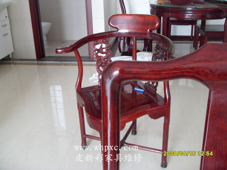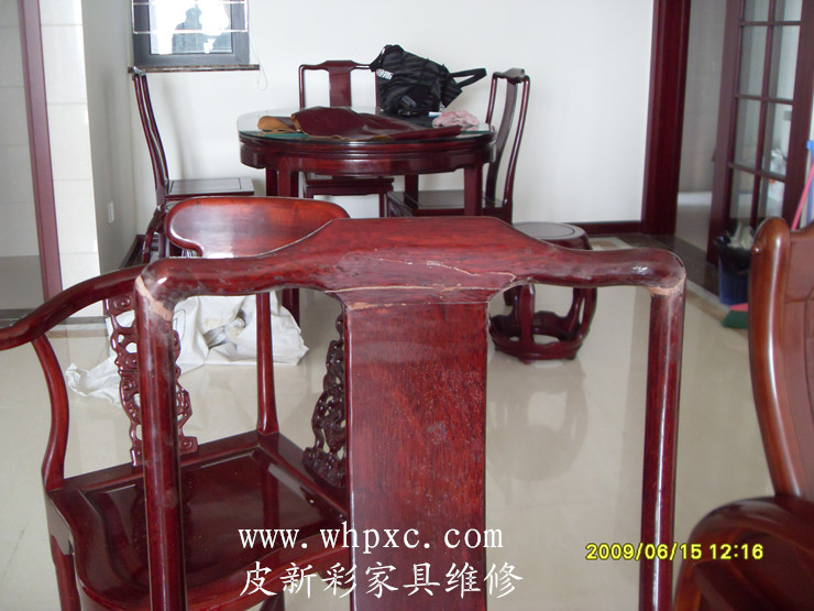 這是做了油漆的假紅木的,時間長了出現開裂,這種木頭比較硬打釘容易炸裂最好是上膠,打釘之前先鉆孔,用鋸末填縫比較好,皮新彩家具補漆電話:13995508166