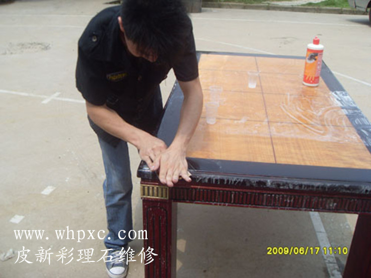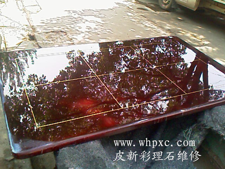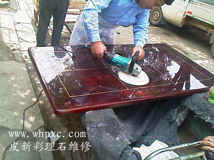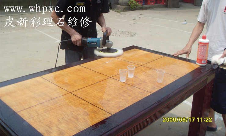 大理石維修,理石漆面容易劃傷,劃傷需要用600#粗砂紙打磨一遍,再用2000#號水磨砂紙加水打磨,最后用拋光蠟加水拋光,皮新彩大理石維修13995508166