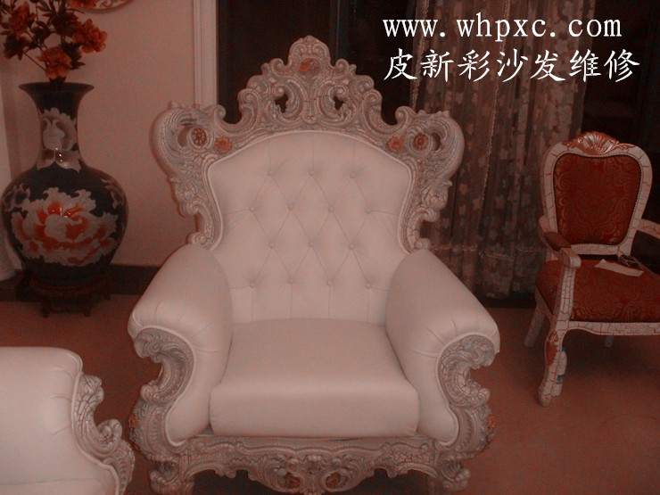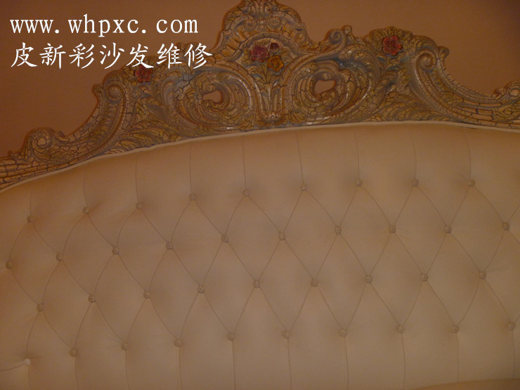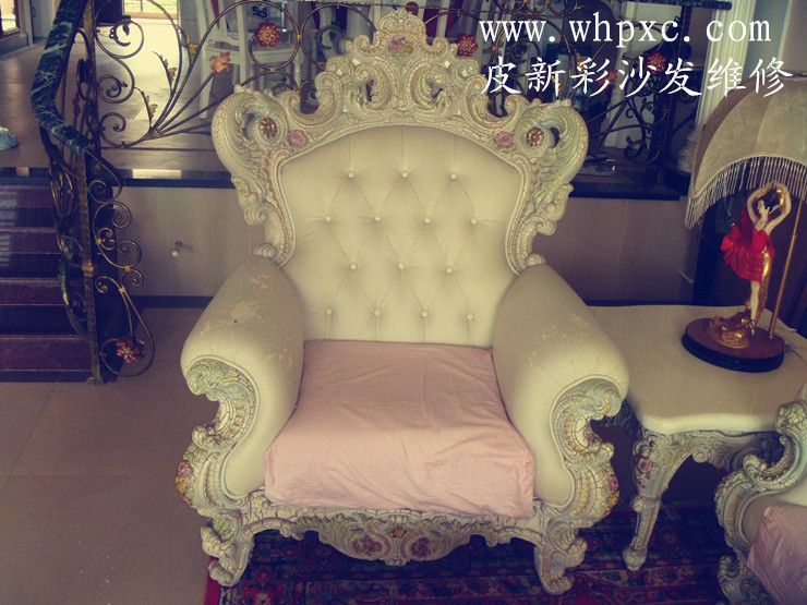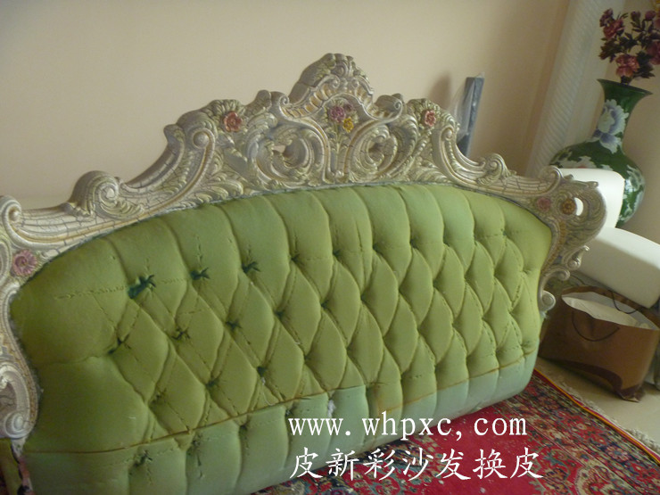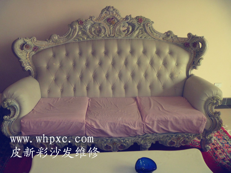 歐式雕花彩色裂紋漆非常漂亮,沙發買時花了3萬左右,只是真皮質量太差,是貼膜二層皮幾年后就出現裂面脫皮,我們皮新彩給她全部換成頭層牛皮又像新的一樣。歐式沙發做工復雜用皮量大,全套換頭層真皮1萬元左右,皮新彩沙發翻新換皮熱線:13554633331